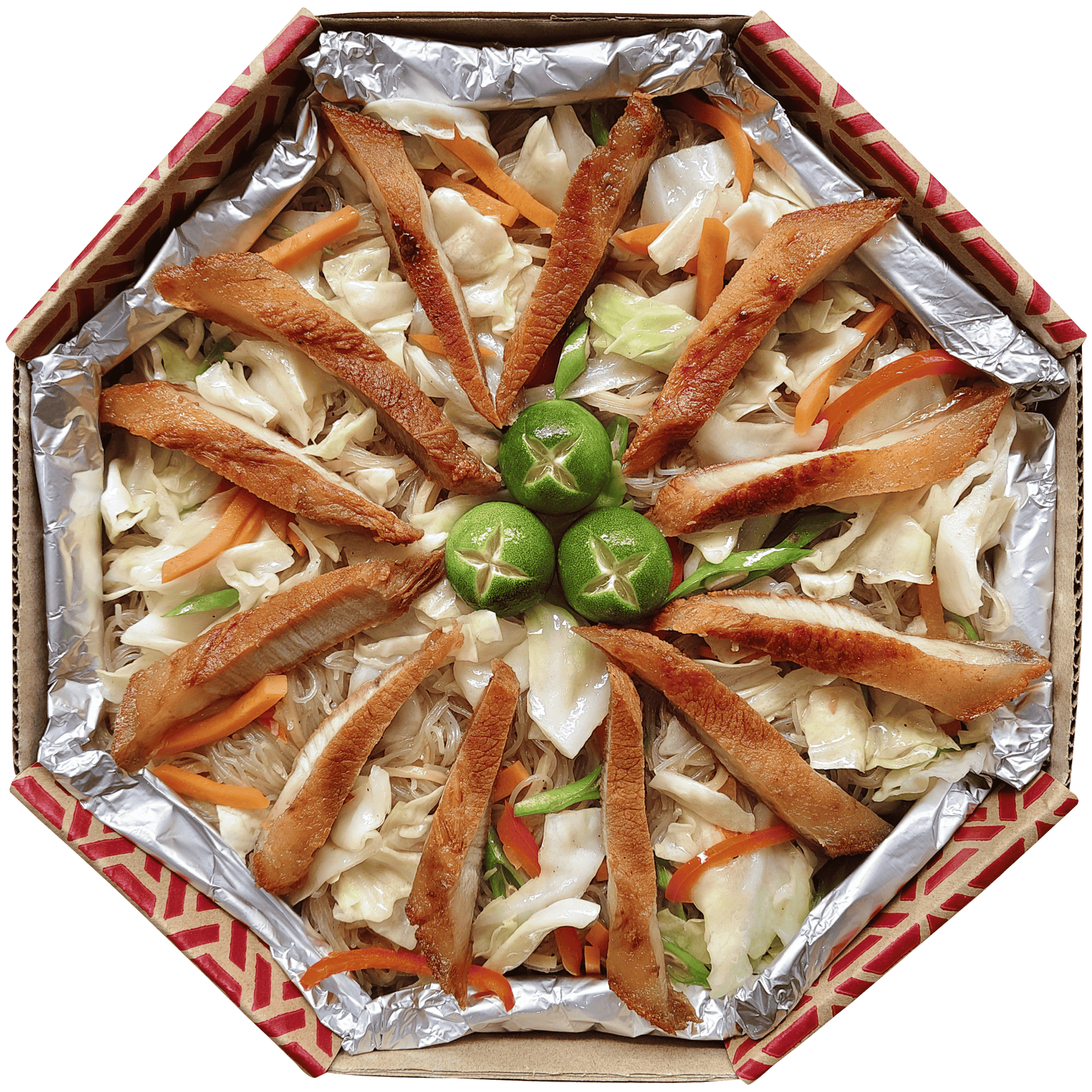 Mixed canton and bihon noodles topped with golden brown lechon kawali strips and mixed vegetables.