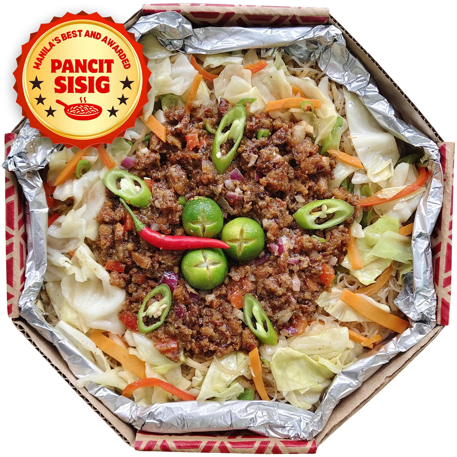 Our bestseller! Mixed canton and bihon noodles topped with our signature pork sisig.